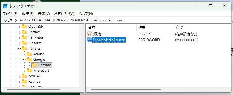EnableMediaRouterにします。 EnableMediaRouterをダブルクリックし、データを0に設定します。- Chromeを再起動(またはPCを再起動)します。